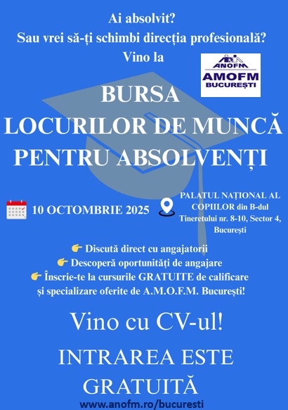 Agenția Municipală pentru Ocuparea Forței de Muncă București (AMOFM) organizează vineri, 10 octombrie 2025, începând cu ora 09:00, Bursa locurilor de muncă pentru absolvenți – un eveniment de referință dedicat sprijinirii integrării tinerilor pe piața muncii.