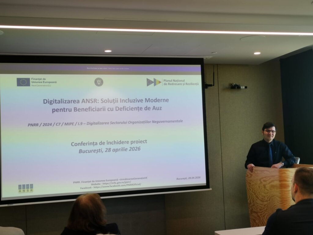 Asociația Națională a Surzilor din România (ANSR) a organizat marți, 28 aprilie 2026, la sediul Microsoft România din București, conferința de închidere a proiectului „Digitalizarea ANSR: Soluții Incluzive Moderne pentru Beneficiarii cu Deficiențe de Auz”, finanțat prin PNRR/2024/C7/MIPE/I.9 – Digitalizarea Sectorului Organizațiilor Neguvernamentale. Evenimentul a marcat finalizarea implementării unui proiect orientat spre modernizarea relației dintre ANSR, beneficiarii cu deficiențe de auz și partenerii organizației, prin dezvoltarea unor soluții digitale accesibile, eficiente și sustenabile.